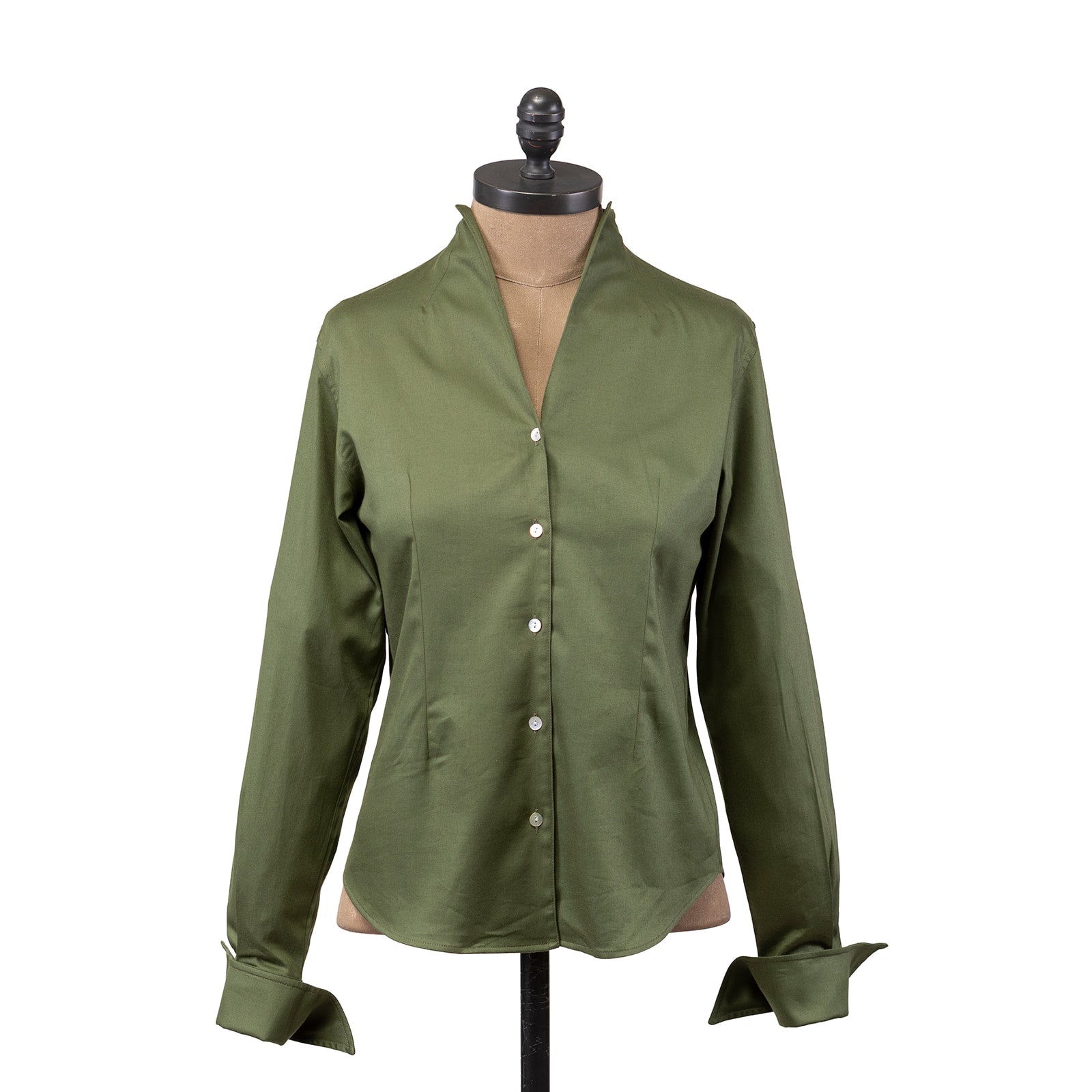 The tulip neck shirt features an elegant neckline as well as open double cuffs.