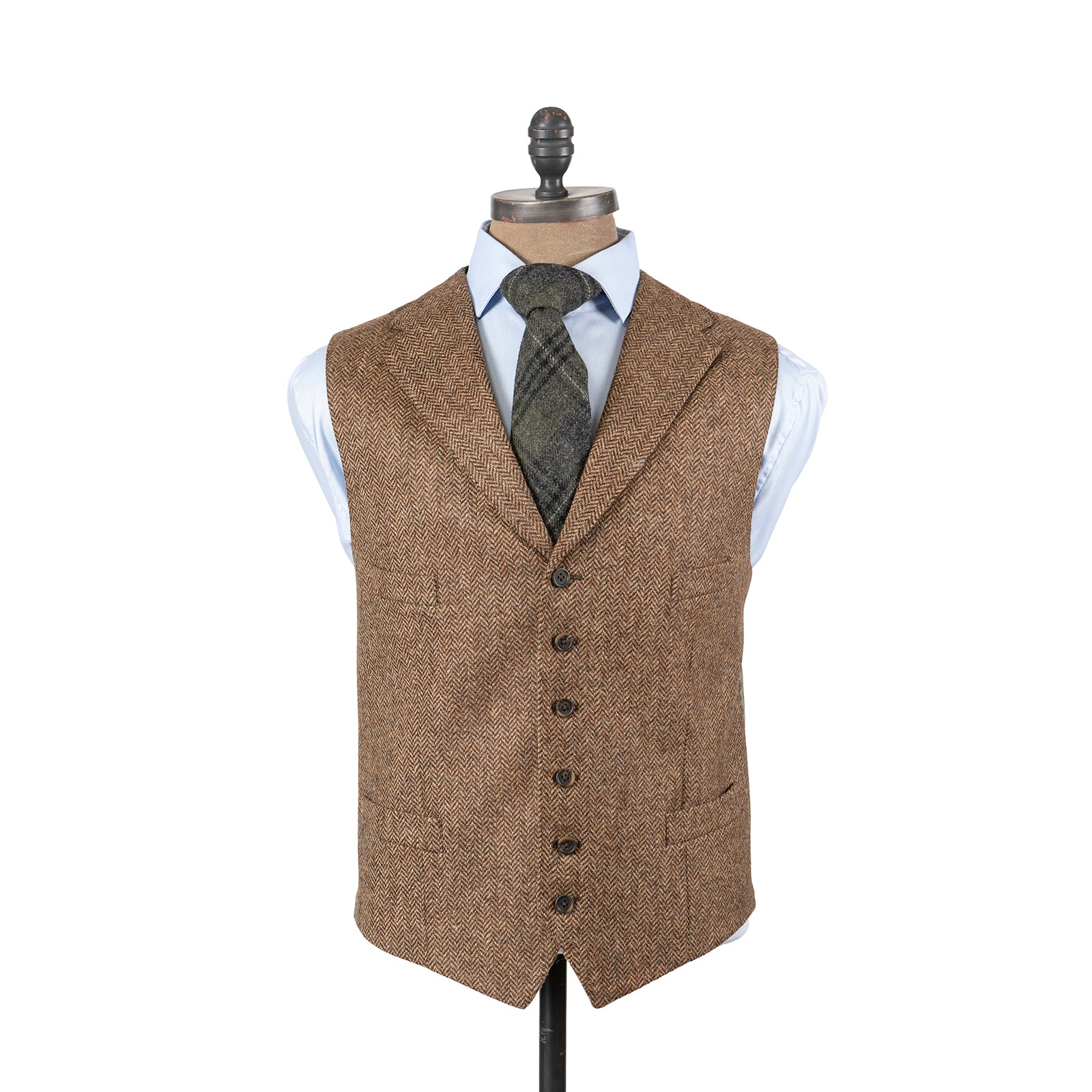 Stewart Christie & Co. MacKellar tweed waistcoat is single breasted with six buttons, lapels, four pockets and a back adjuster strap.