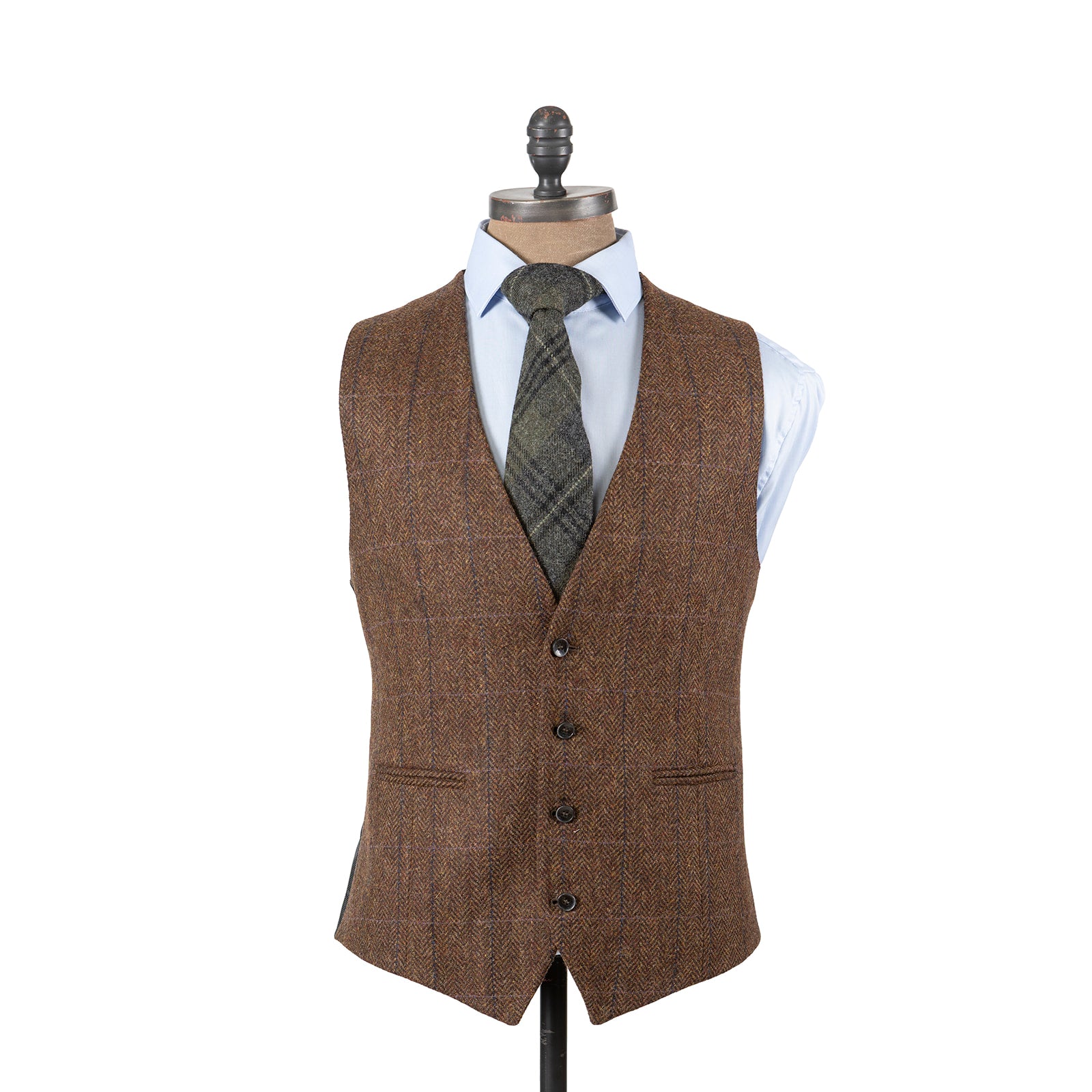 Stewart Christie & Co. Milo tweed waistcoat is single breasted with four buttons, two pockets and a back adjuster strap.